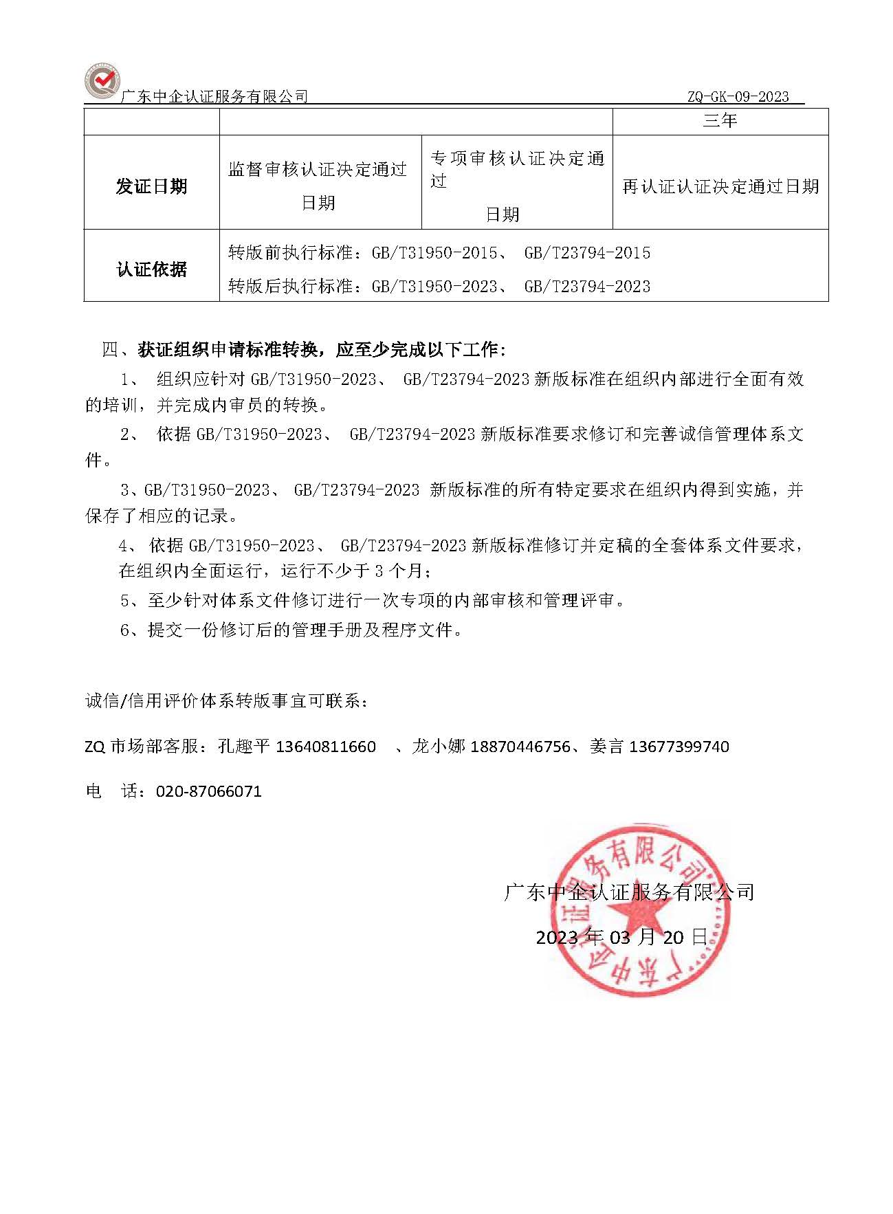 关于GB/T31950-2023/ GB/T23794-2023标准转换获证客户告知书