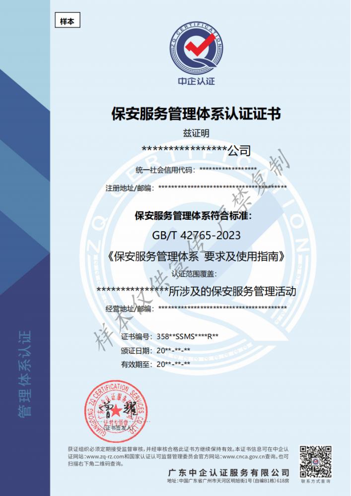 2023年11月,市场监管总局(国家标准委)批准发布《保安服务管理体系要求及使用指南》国家标准,于2024年6月1日起实施。该标准规定了保安服务管理体系的基本要求,提供了风险管理的框架,以及保安服务组织环境、领导作用、策划、支持、运行、绩效评价及改进等管理体系建设的主要内容和要求。首次建立了我国保安服务的管理体系,并为该行业提供了保安服务管理的基本框架和参考,旨在通过采用先进化、系统化、科学化的管理技术和方法,提高安保从业组织的保安服务管理水平,对保安行业发展具有重要的经济意义和社会意义。